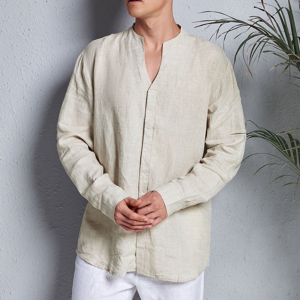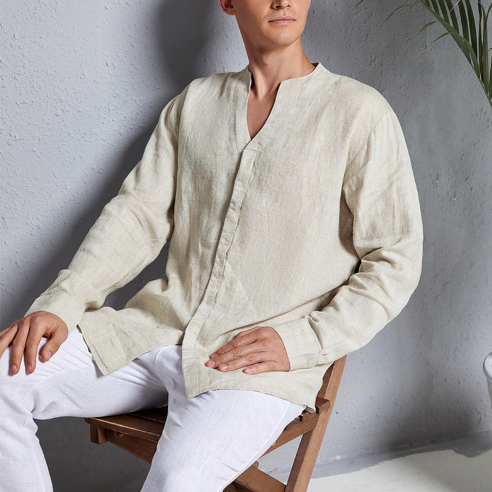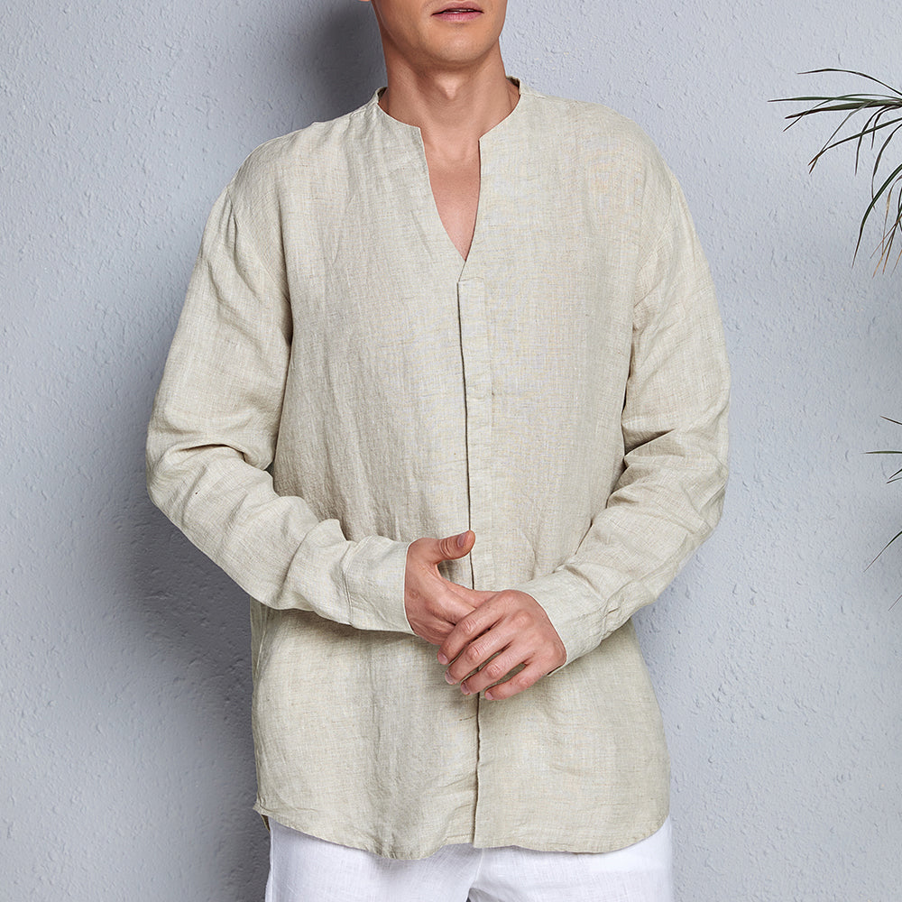 Men's 100% Linen Casual Long Sleeve V-neck Shirt A021