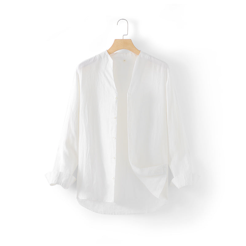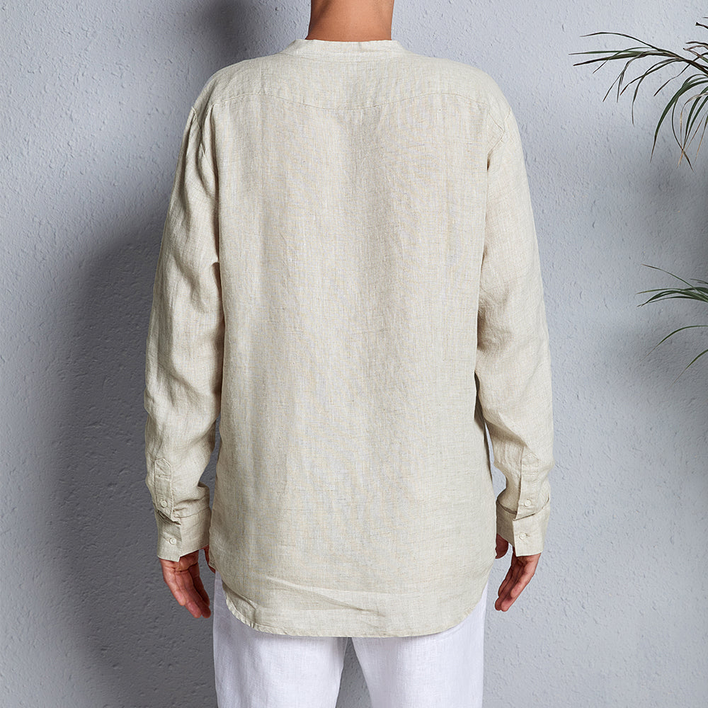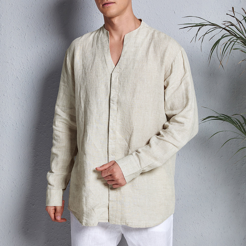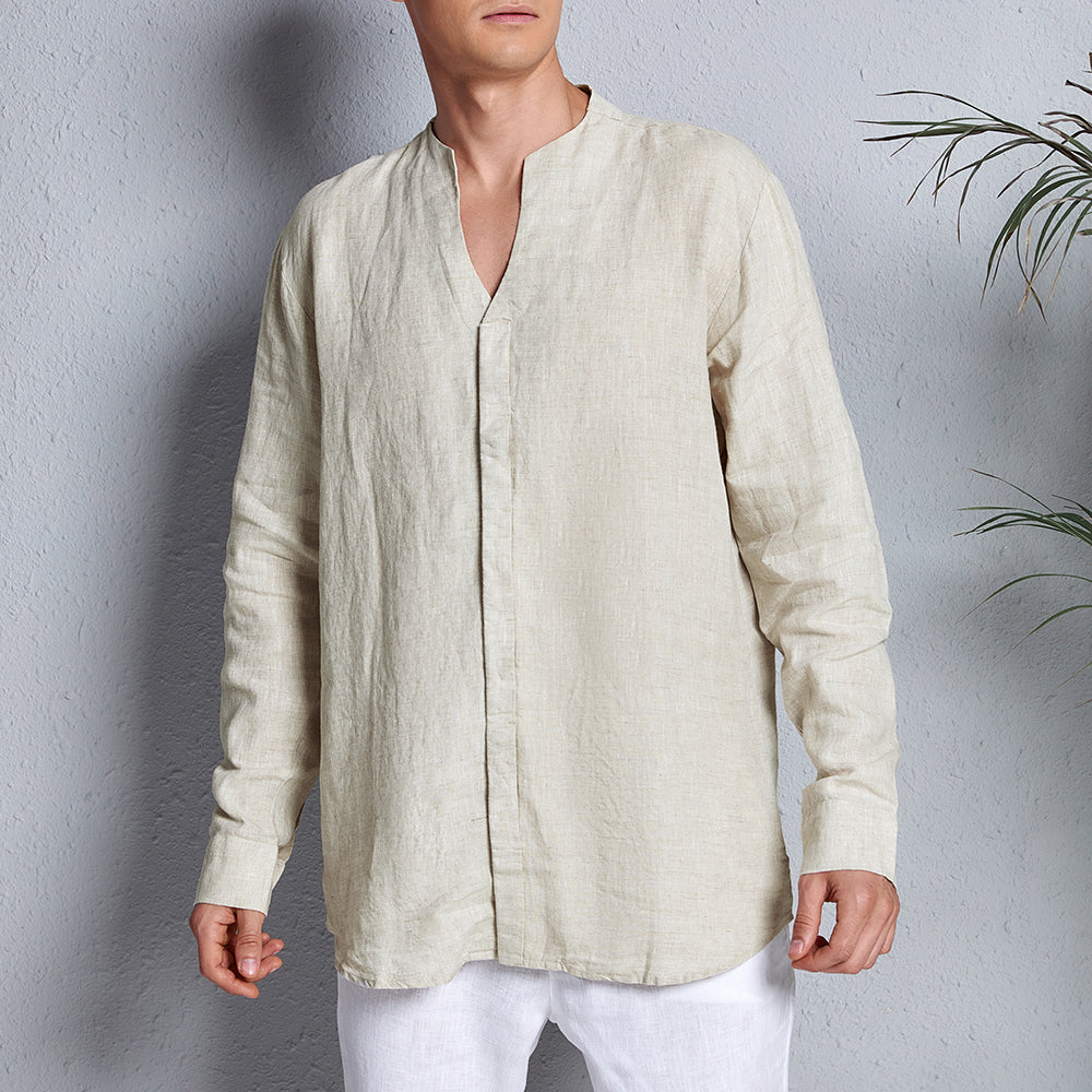 Men's 100% Linen Casual Long Sleeve V-neck Shirt A021
