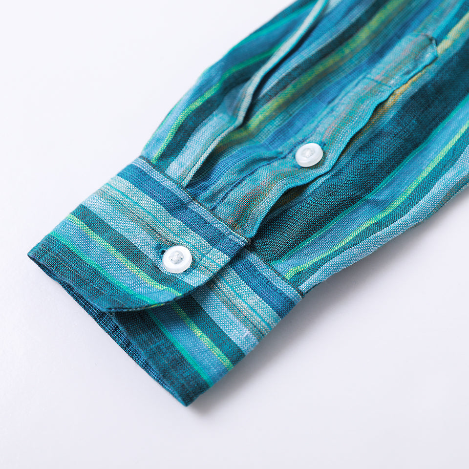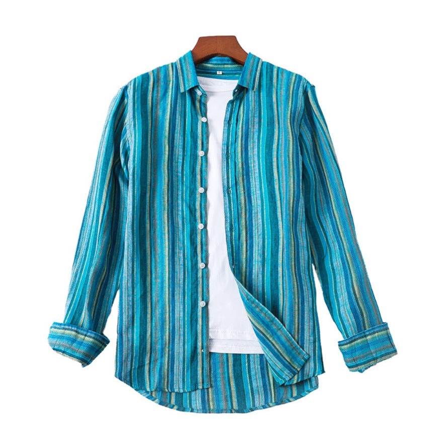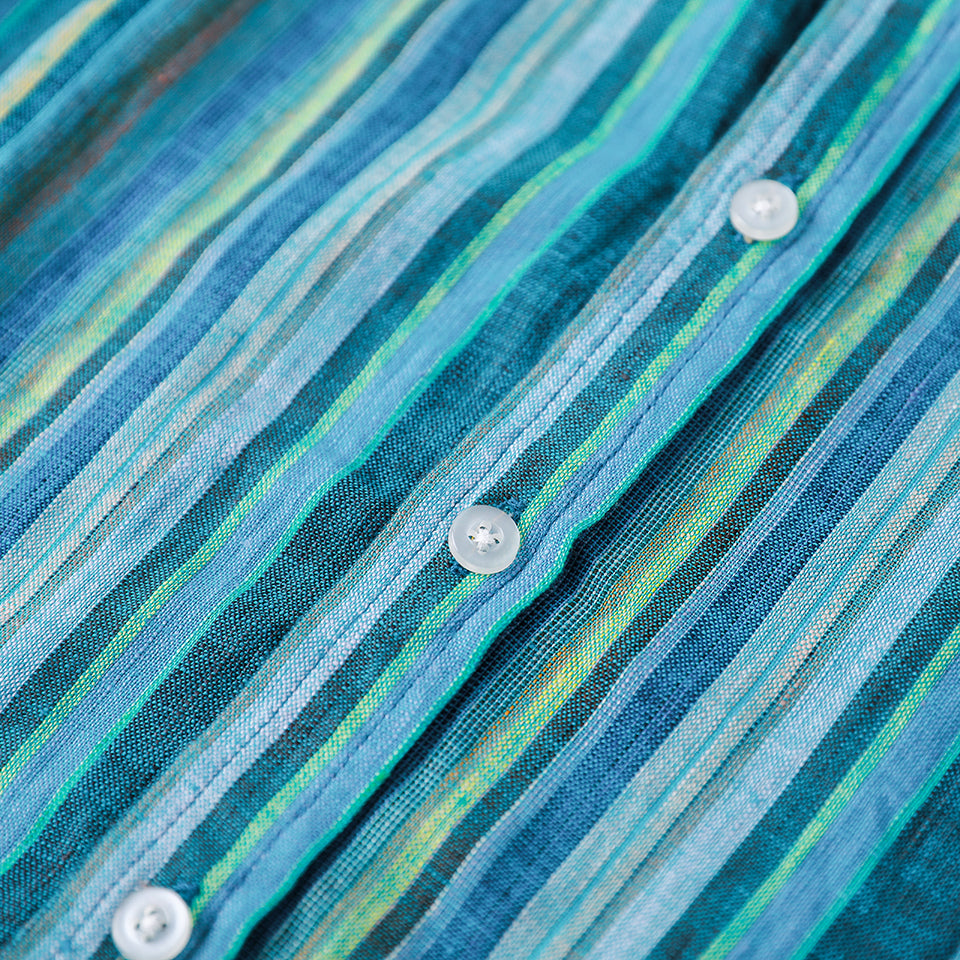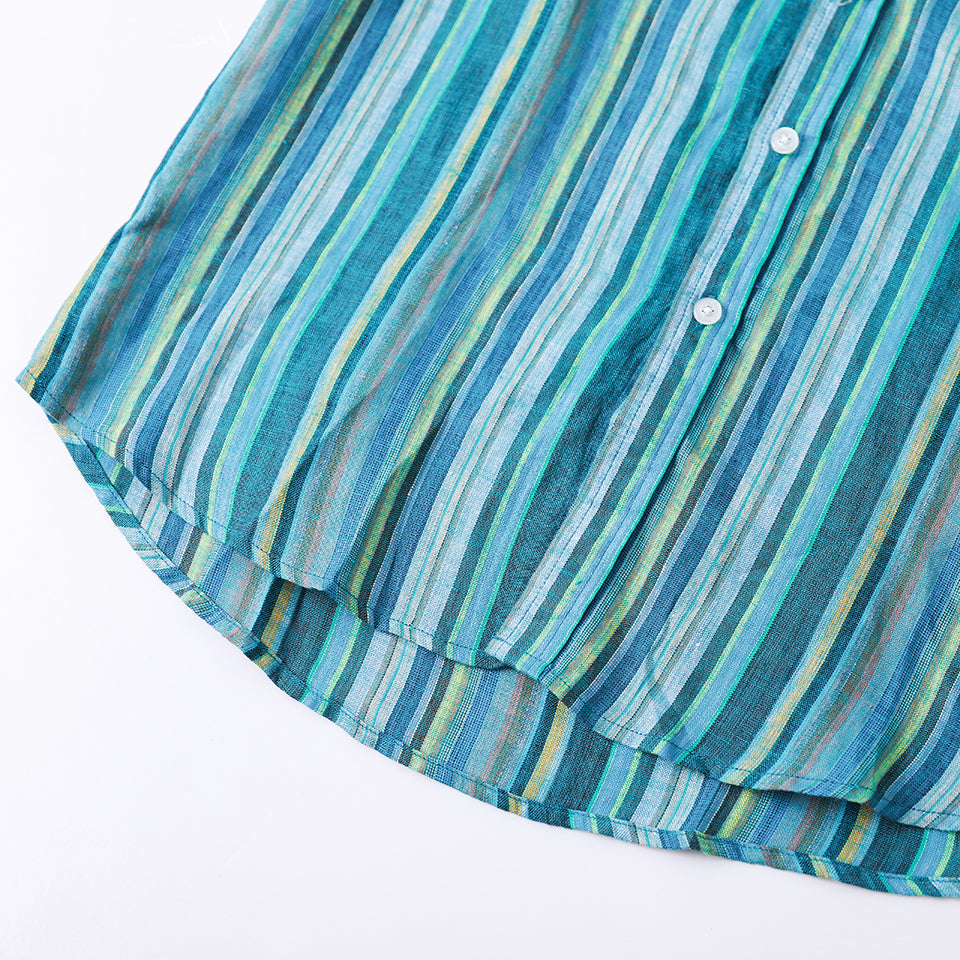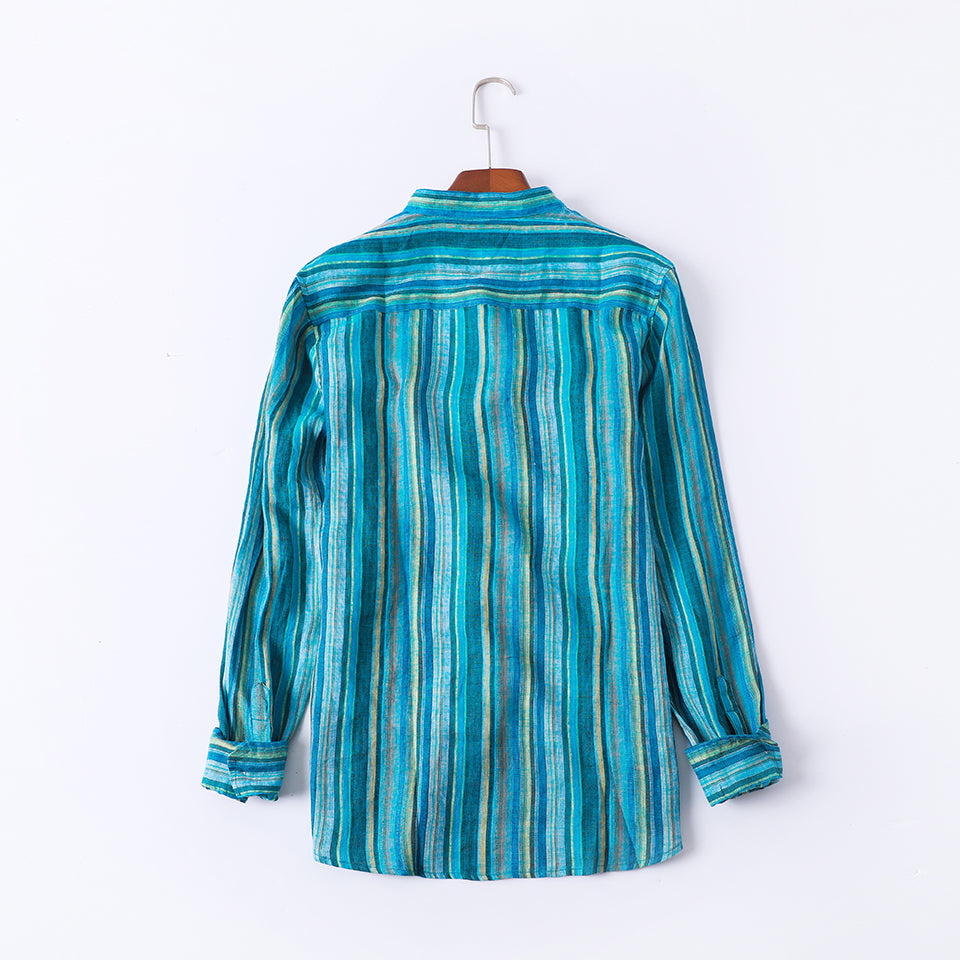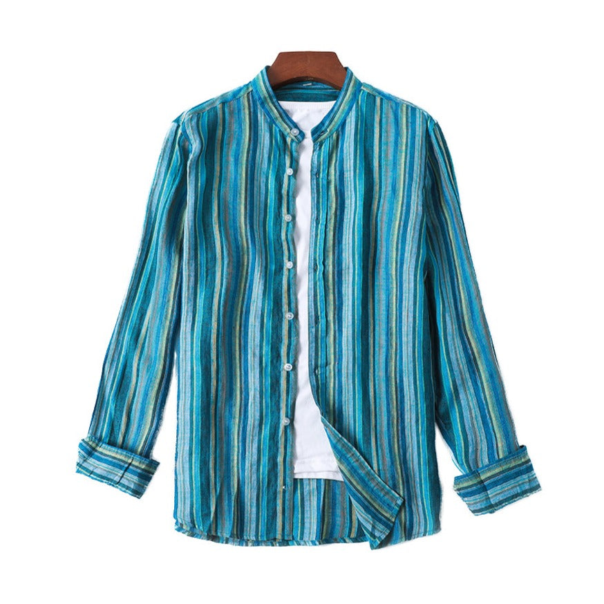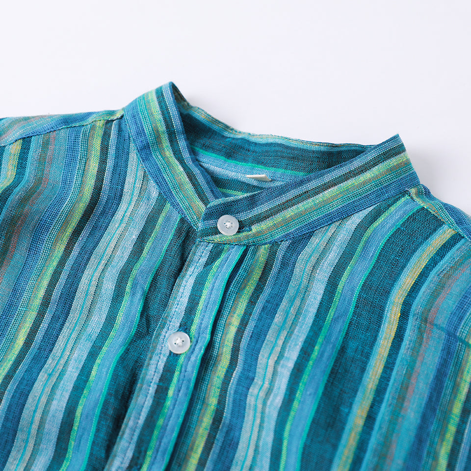 Men's 100% Linen Classic Colorful Striped Collarless Shirt B052