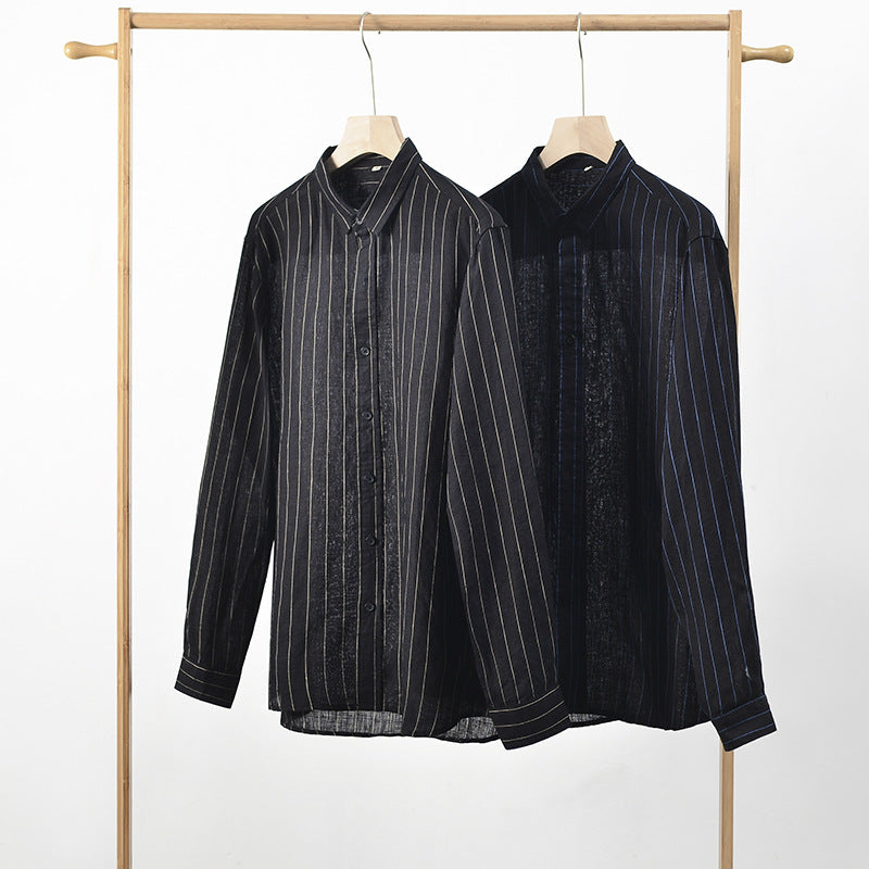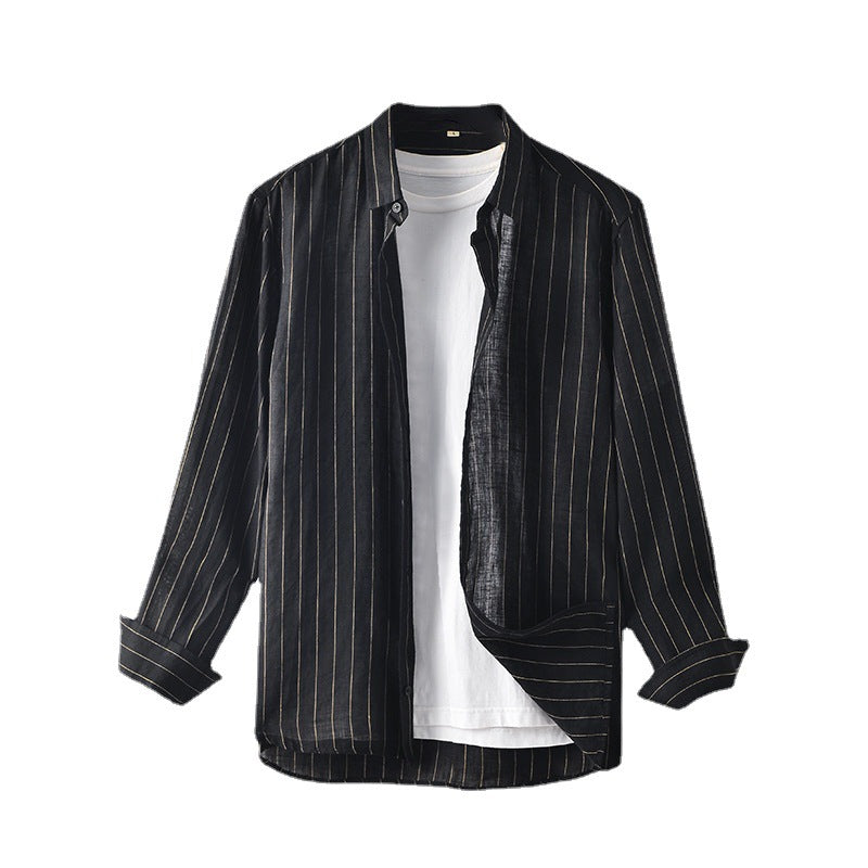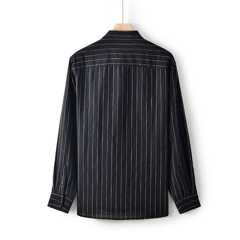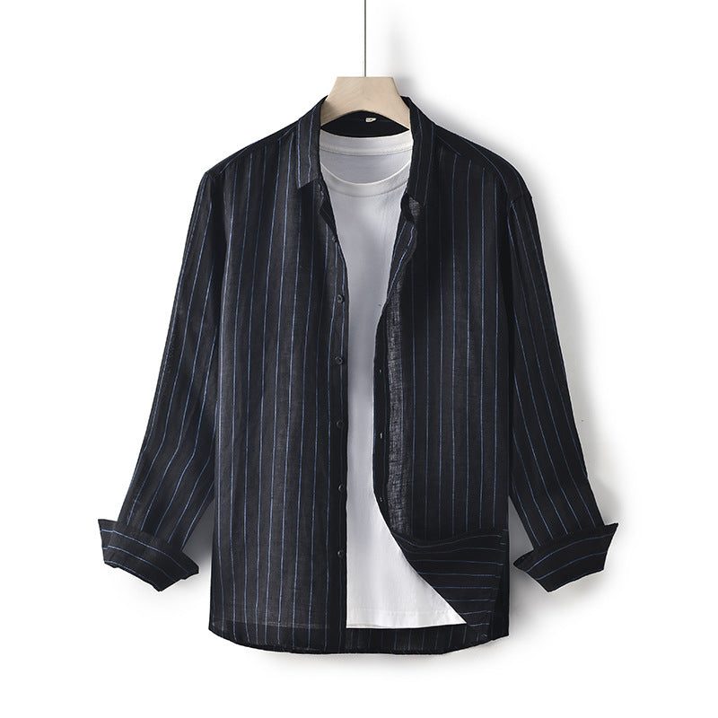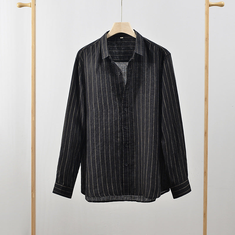 Men's Linen Lapel Striped Long-sleeved Shirt Loose and Breathable F007